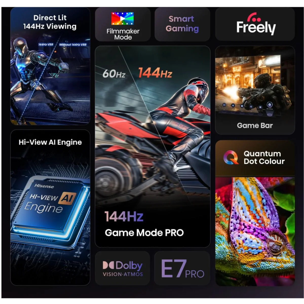 Reviewers say the 65‑inch E7Q Pro delivers a large, colourful picture with a high refresh rate and VRR support that suits gaming, and the Freely platform offers plenty of apps. They like its support for Dolby Vision and HDR10+. However, black levels are middling and haloing can occur, and the TV doesn’t reach the brightness of pricier models, so HDR has limited impact. As with other sizes, the viewing angle is narrow and some presets need tweaking for accurate colour.